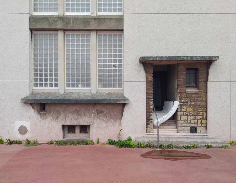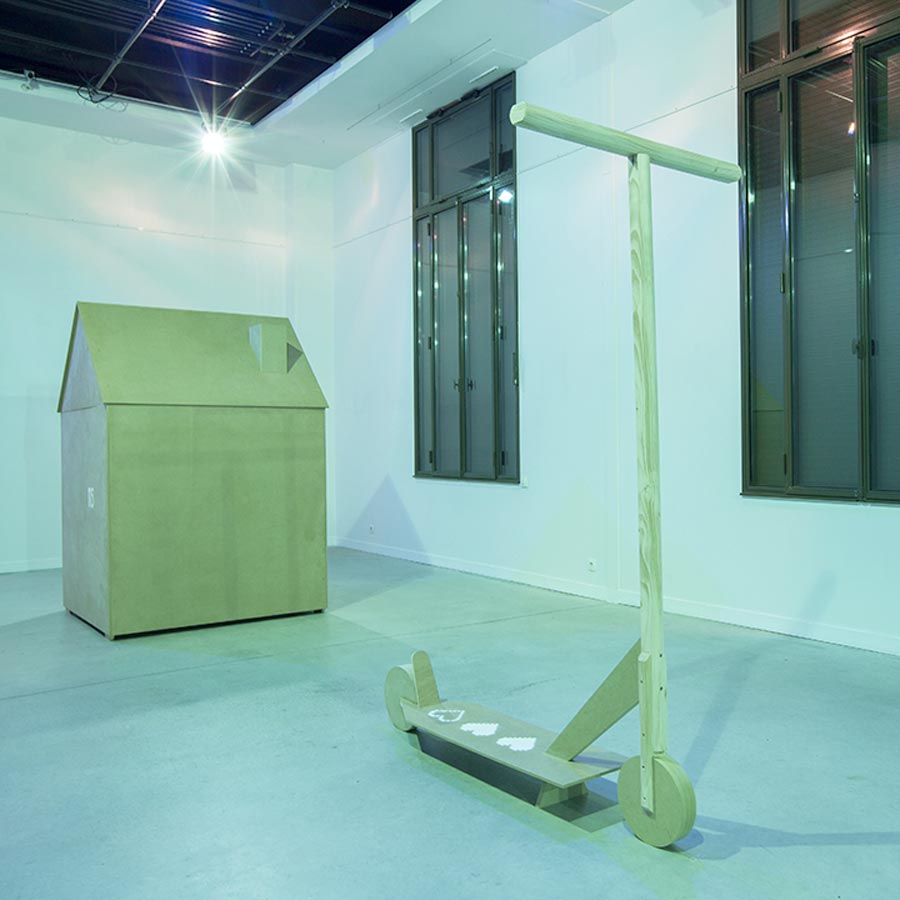 Élevé à la campagne, son aire de jeu n’avait rien à voir avec les espaces contraints des petits urbains. C’est en kilomètres que se mesurait son playground, tant l’étendue était large et ouverte au regard autant qu’à l’expérience. Son rapport au construit s’est noué également à une échelle plus restreinte : une construction réalisée en paille reste encore dans son souvenir comme une architecture immense et enveloppante, menaçante presque. Autre instant, plus récent, la vision d’un gamin sortant du métro rennais et se faufilant au coin de la rue dans le trou d’un mur pour rentrer chez lui… dans un squat. […] Cette cristallisation autour d’un rapport étonné à ce qui nous entoure nourrit ses projets et le conduit à « observer le monde par le prisme de l’enfance ». La place du jeu est donc essentielle dans sa pratique […]. La logique de ses travaux propose […] un rapport actif avec ses œuvres […]. Il joue des relations complexes entre le corps et les espaces construits, des rapports d’échelle qu’il distend parfois dans des inversions façon Alice au pays des merveilles. Réalité et imaginaire s’y entrelacent, floutant les limites convenues. Dans les interstices avec le connu s’ouvre l’imagination […]. Et logiquement, l’écriture apparait maintenant comme composante de ses projets […] sous formes de lectures performées […] articulant installation, textes et bande son […]. Un travail empreint des réalités contemporaines qui structurent nos sociétés […] peut-être sa manière d’habiter poétiquement le monde.